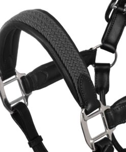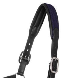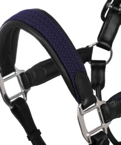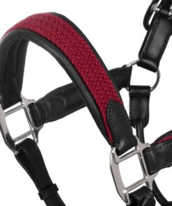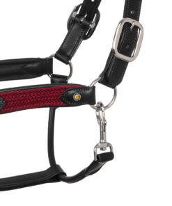 Equestro Leather halter with stainless steel buckles and woven nylon fiber inserts. The high quality materials make the item durable and comfortable.