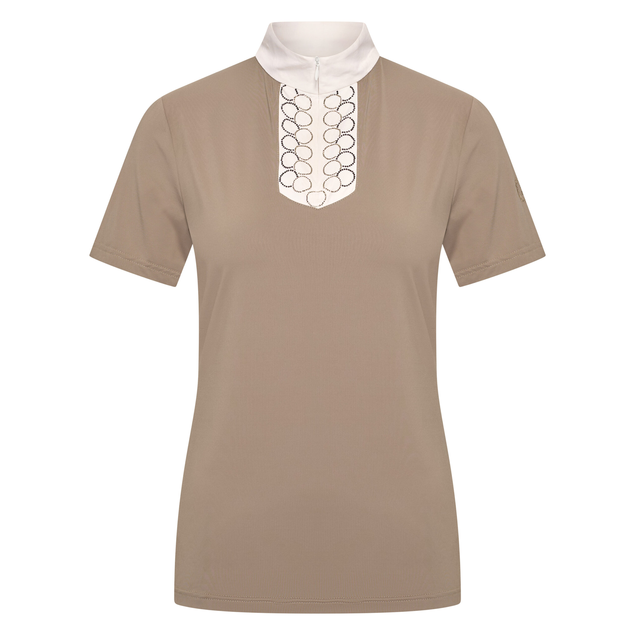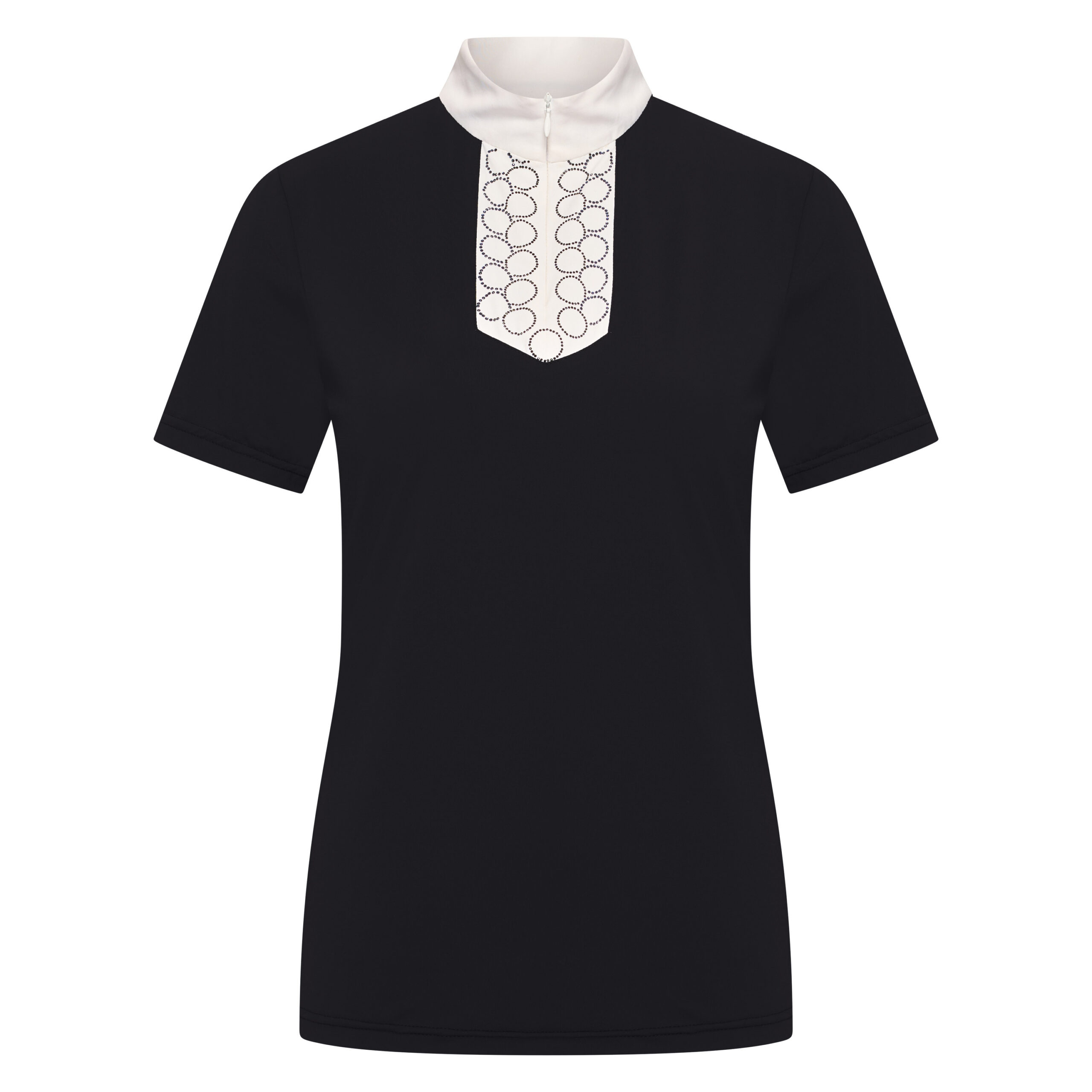Ready to stand out in the arena? The Imperial Riding Competition Shirt Shine is designed for riders who want to combine elegance, comfort, and eye-catching style. This short sleeve competition shirt features a crisp white collar and front panel, beautifully enhanced with sparkling two-tone rhinestone details for a truly glamorous look.