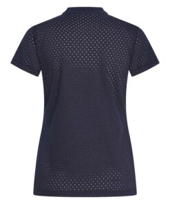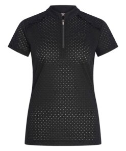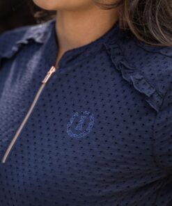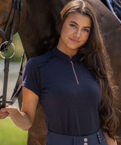 Imperial Riding Women’s Polo Shirt Phoenix combines elegance with everyday riding comfort. Designed with equestrians in mind, this stylish polo features delicate broderie anglaise fabric for a feminine touch, chic cap sleeves, a refined standing collar, and charming ruffle details. Finished with a subtle metal logo charm, it’s perfect for both training and casual wear at the stables.